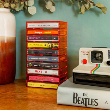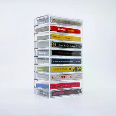 Of je nu je verzameling wilt uitbreiden of oude mixtapes uit de kast haalt, dit transparante rack geeft je collectie een stijlvolle plek. Het minimalistische design past in elk interieur en laat je tapes zelf spreken. Een onmisbaar accessoire voor elke cassetteliefhebber.